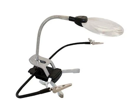 Helping hands kit with flexible head includes 2x & 4x magnification with duel LED for lighting you work space. Flexible arms are equipped with alligator clips and are locked with wingnuts for perfect positioning. Also includes stabilizing legs and table / work clamp. Requires 3 AAA batteries (not included).