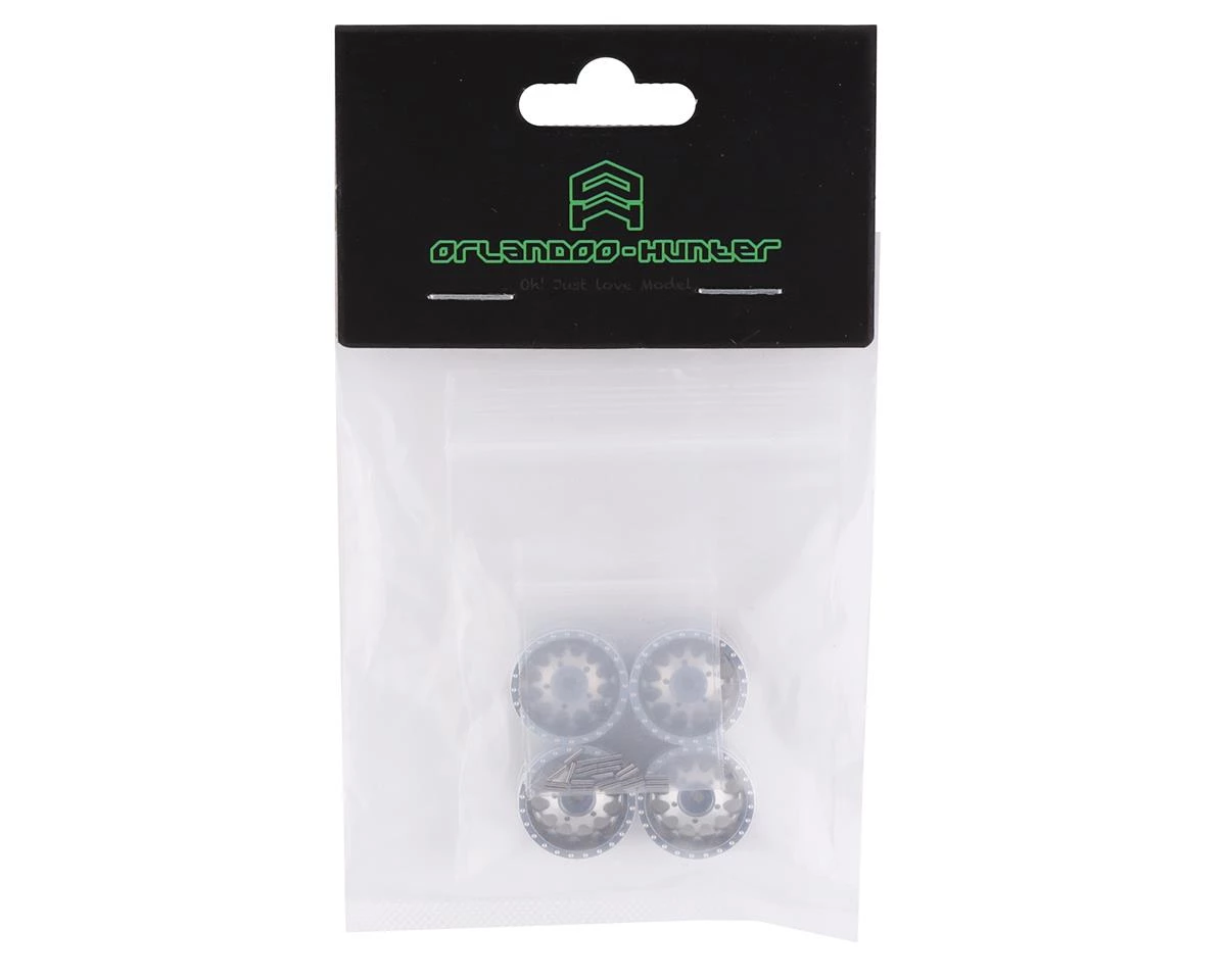 Orlandoo Hunterย 18mm Aluminum Wheel Set. These optional wheels are a high quality alloy that features small pins to insert as faux lug nuts to add even more micro size detail! Package includes four wheels intended for the Orlandoo Hunter models.
