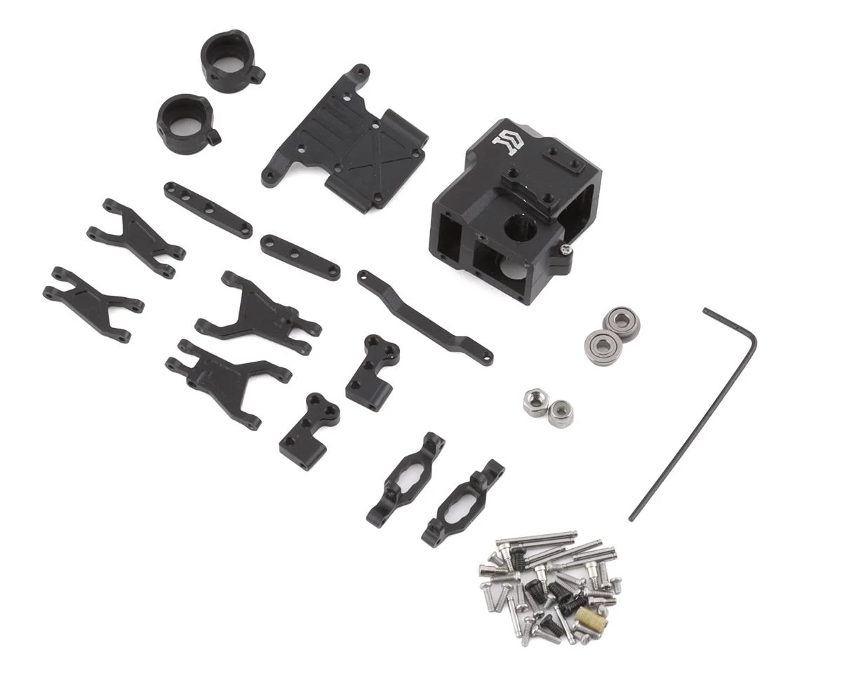 The Orlandoo Hunter Aluminum Independent Suspension Kit is a great optional upgrade for the front suspension found in the stock 32P02 truck. This kit will not only give your Orlandoo some bling but it will also give you a very durable front end. While this kit does include most components, some parts from the factory transmission will need to be transferred over. Package includes black anodized aluminum transmission case, skid plate, upper and lower suspension arms, C-hubs, steering knuckles, steering arms, drag link and hardware. Â